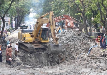 As of 4am, three excavators were busy scooping out gallons of waste water out of the crater after a sewerage pipe broke, softening soil and marine clay there.